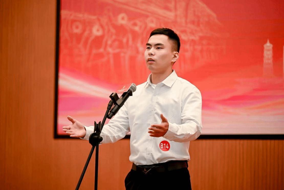 王靖嘉同学以小时候看望志愿军老战士讲起,以一直燃烧在心中的那团火为线索,讲述了从崇敬之火到使命之火、传承之火、奋斗之火的思想行动递进历程,表达了对英雄的崇敬和对时代青年使命担当的理解,展示了立志守住历史文化“阵地”、用文化交流打破偏见壁垒的青春誓言。