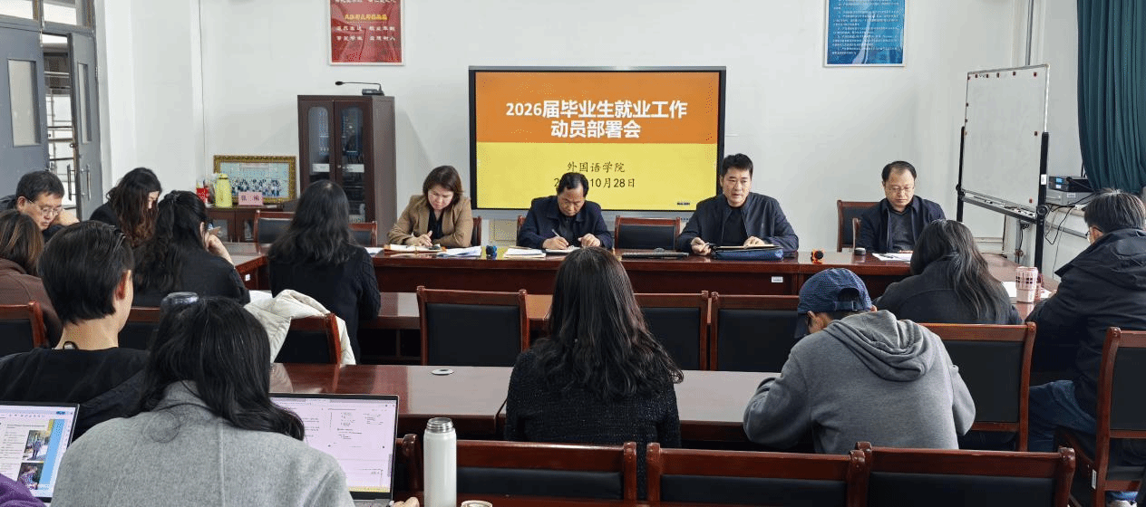 【通讯员 宋新新】为凝聚共识、压实责任,早谋划、早进入,推进学院2026届毕业生就业工作,10月28日,外国语学院召开2026届毕业生就业工作动员部署会。全体院领导、系主任、毕业班研究生导师、班主任、辅导员参加,会议由院党委副书记李刚主持。
