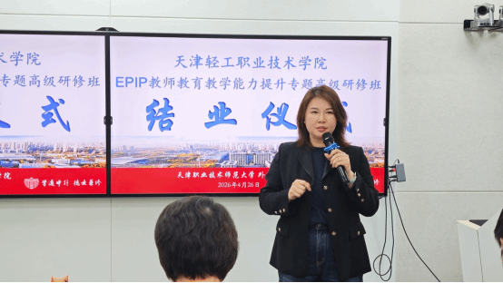 天津轻工职业技术学院教务部副部长杨国星作为学员代表发言。她对天职师大精心组织培训、专家团队悉心授课表示感谢,分享了本次研修在理论认知、实践应用、教学创新上的全面收获。她代表全体学员承诺,将把EPIP带回教学一线,推动成果落地转化,以教学实效助力学校职业教育创新发展。